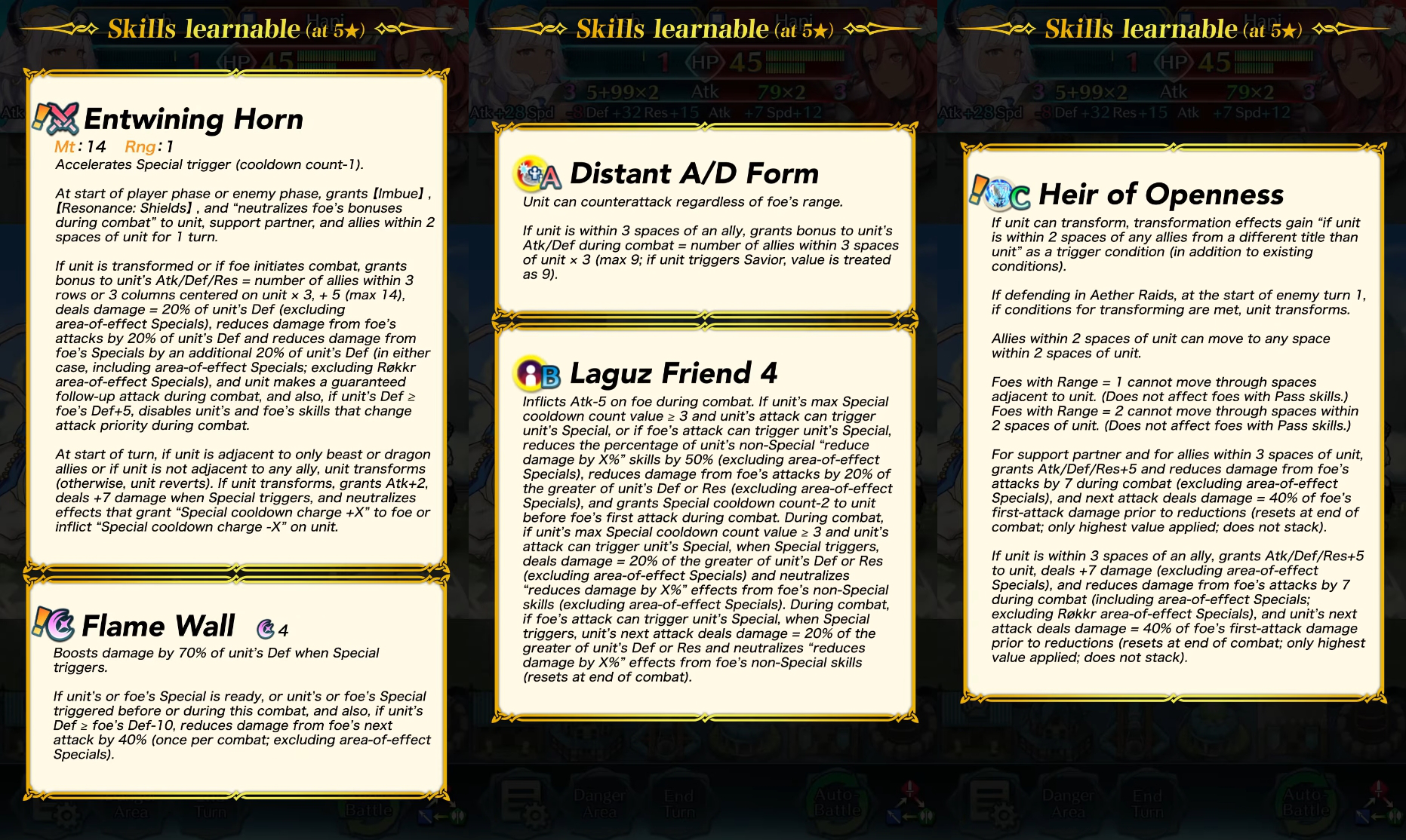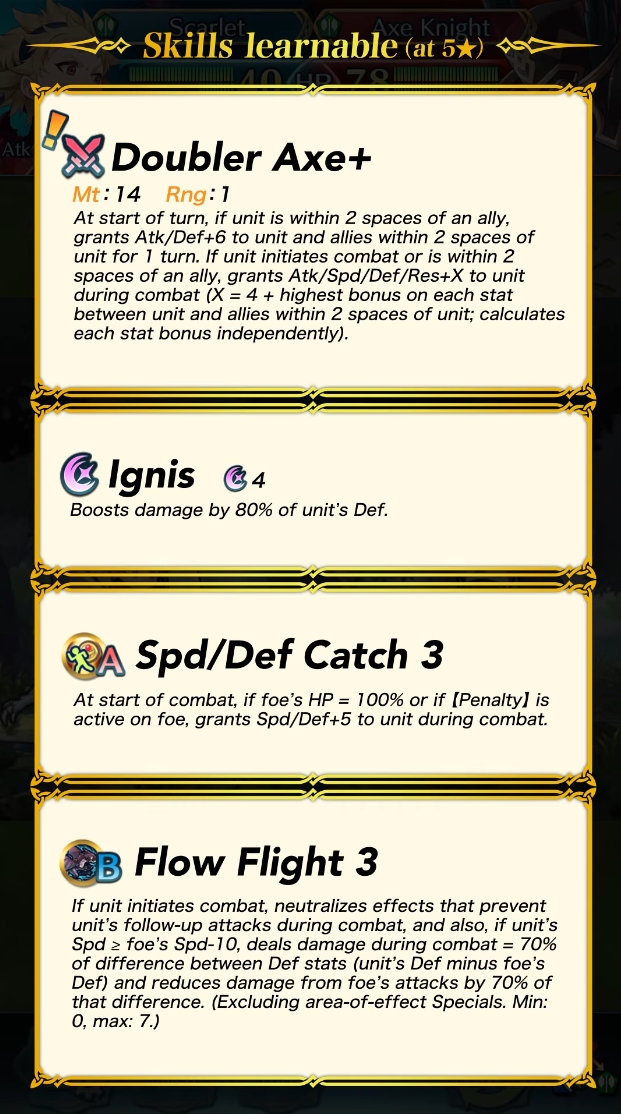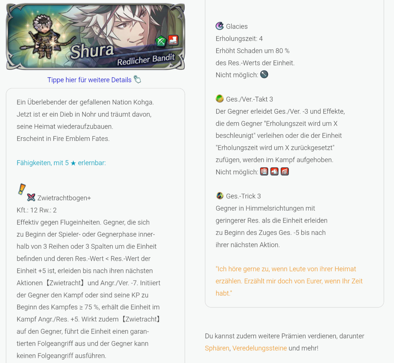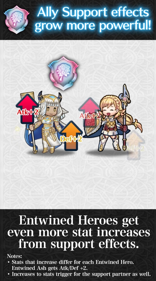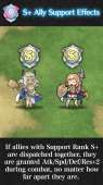 - Verbündetenhilfe mit Rang S+: Das Paar erhält Angr./Ges./Ver./Res. +2, wenn sich beide auf der gleichen Karte befinden - unabhängig von ihrer Position